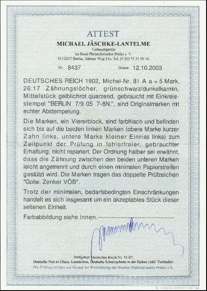 | Prüfer: | Jäschke-Lantelme, Michael (BPP (Bund Philatelistischer Prüfer)) |