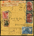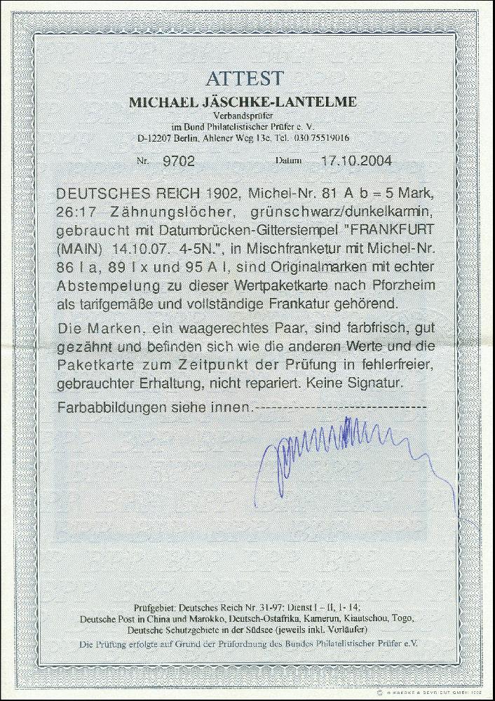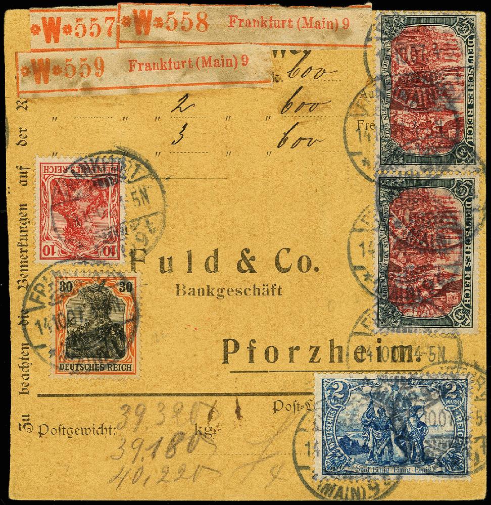 | Zusatzinformationen und Suchstichworte: | 366. Auktion Heinrich Köhler Auktionstermin 19.-24.03.2018 Los 1502 5 M. grünschwarz/dunkelkarmin (karmin quarzend), waagerechtes Paar in Mischfrankatur mit Friedensdruck 2 M. schwarzblau sowie Germania 30 Pfg. und 10 Pfg. als portogerechte Frankatur auf Paketkarte für drei Wertpakete von "FRANKFURT 14.10.07" nach Pforzheim mit Ankunftsstempel, gute Gesamterhaltung, Fotoattest Jäschke-L. BPP Ausruf 150,00 EUR |