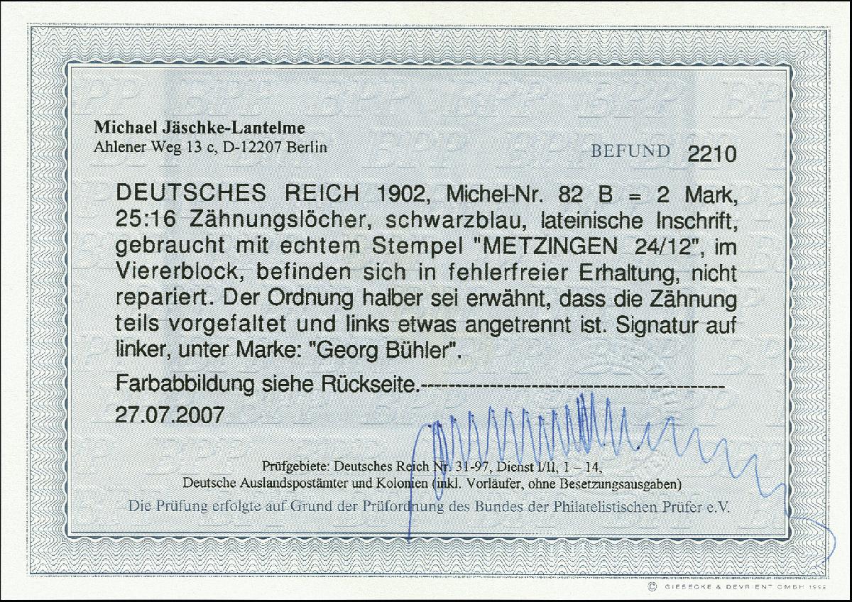 | Prüfer: | Jäschke-Lantelme, Michael (BPP (Bund Philatelistischer Prüfer)) |