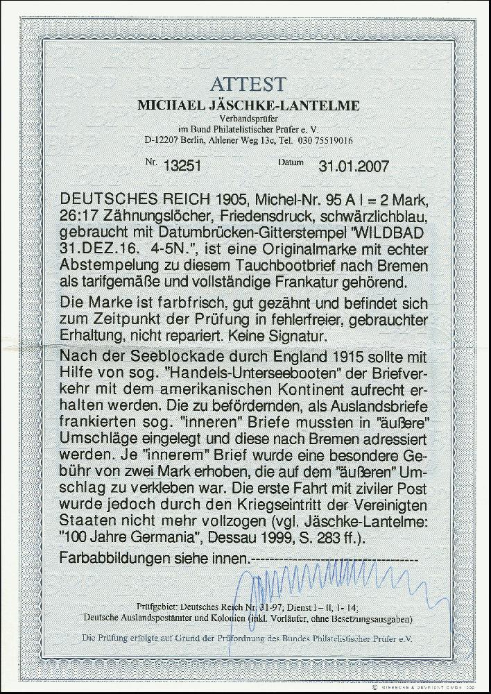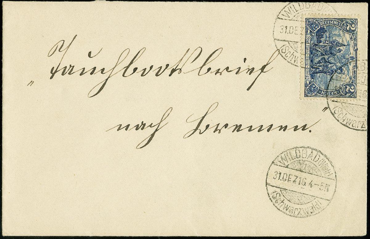 | Zusatzinformationen und Suchstichworte: | 366. Auktion Heinrich Köhler Auktionstermin 19.-24.03.2018 Los 1516 2 M. schwarzblau als portogerechte Einzelfrankatur auf Tauchbootbrief-Außenumschlag von "WILDBAD 31.DEZ.16" nach Bremen, rückseitig mit kpl. Absendervermerk, tadellose Erhaltung, in dieser Qualität selten, Fotoattest Jäschke-L. BPP (2007) Zuschlag 120,00 EUR |