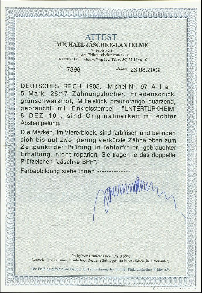 | Prüfer: | Jäschke-Lantelme, Michael (BPP (Bund Philatelistischer Prüfer)) |