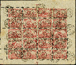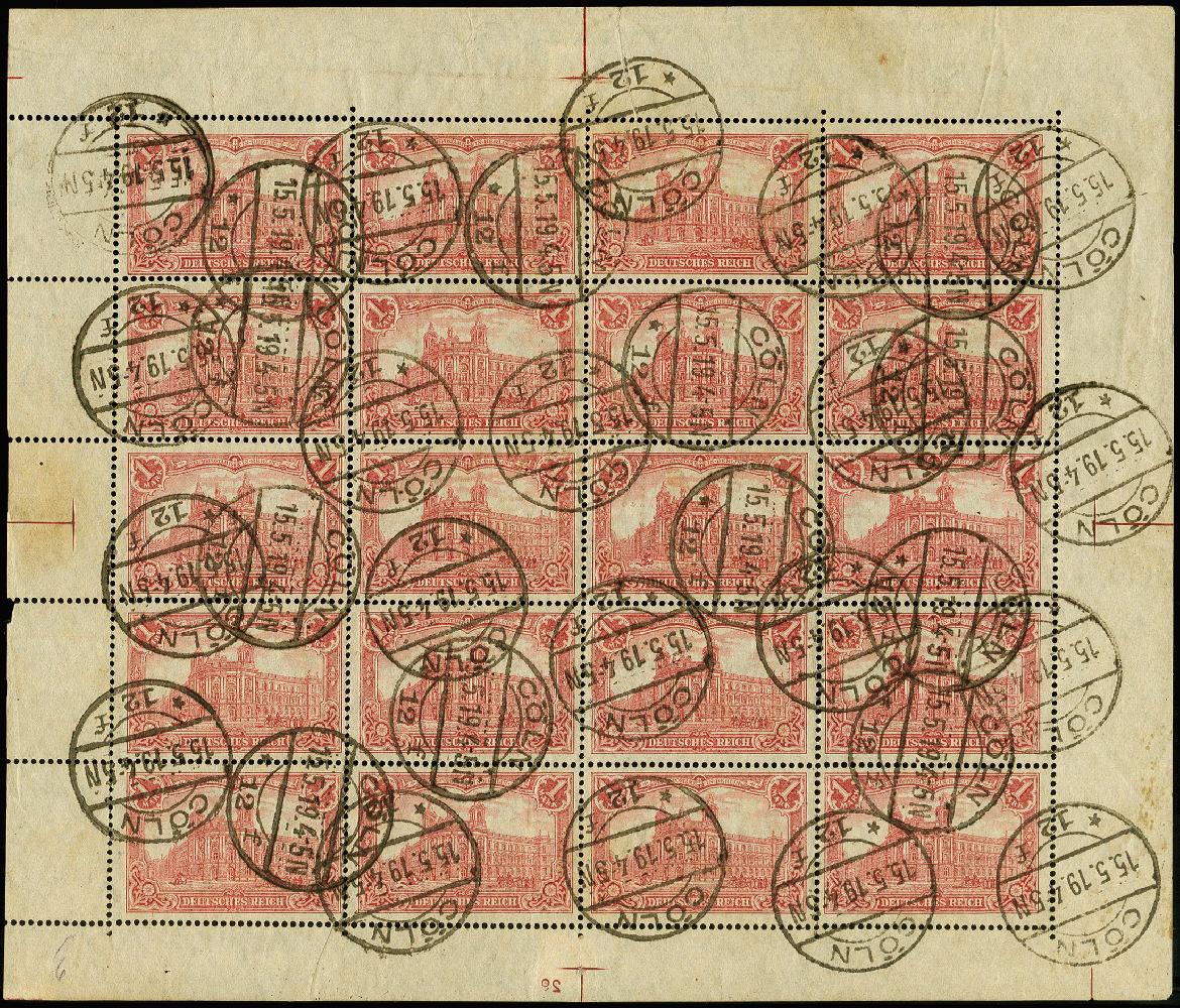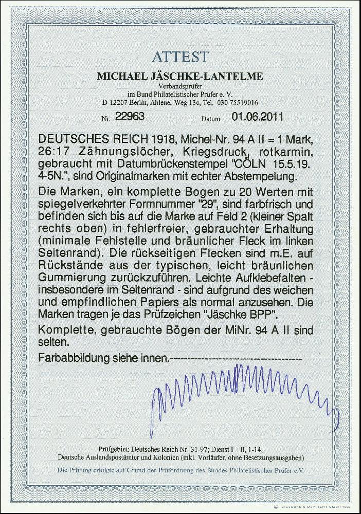 | Zusatzinformationen und Suchstichworte: | 366. Auktion Heinrich Köhler Auktionstermin 19.-24.03.2018 Los 1527 1915/19, Kriegsdruck, Zähnung 26:17: 1 M. rotkarmin im kpl. Bogen mit 20 Werten und spiegelverkehrter Formnummer "29" unten im Rand, jeder Wert mit mindenstens zwei Stempeln von "CÖLN 15.5.19" entwertet, ein Wert mit winzigem Spalt, ansonsten in guter Gesamterhaltung, rückseitige Flecken stammen laut Fotoattest Jäschke-L. BPP (2011) von den Rückständen der typischen, leicht bräunlichen Gummierung; sehr seltene Verwendung aus dem Bedarf, vermutlich von einer Gebührenquittung stammend (Mi. 3.000,- ++ ) Ausruf 800,00 EUR |