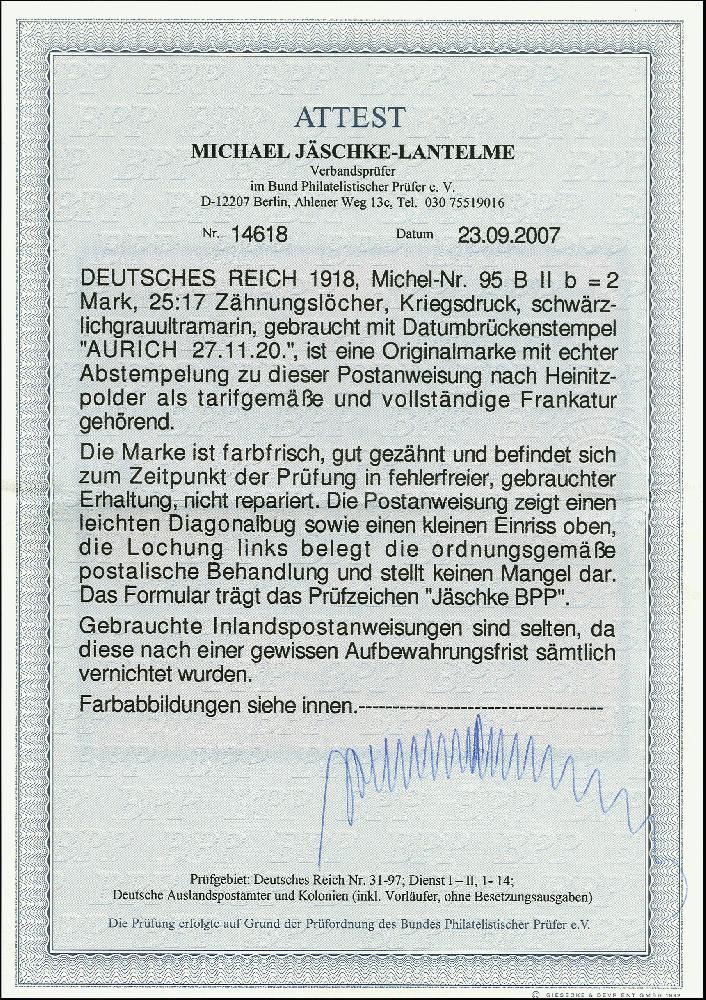 | Prüfer: | Jäschke-Lantelme, Michael (BPP (Bund Philatelistischer Prüfer)) |