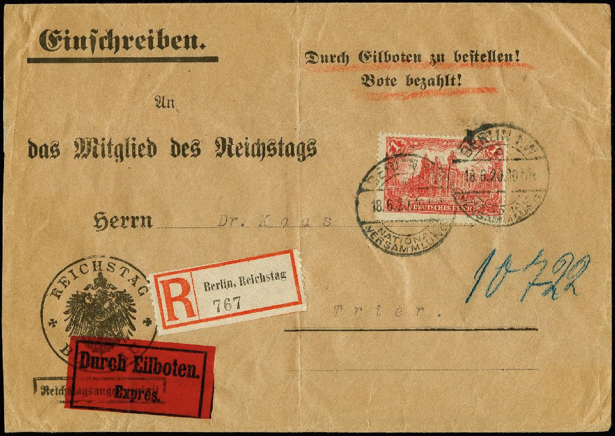 | Zusatzinformationen und Suchstichworte: | 366. Auktion Heinrich Köhler Auktionstermin 19.-24.03.2018 Los 1563 1 M. rot (bräunlichlila quarzend) für die Eilbotengebühr auf sonst portofreiem R-Brief "Reichsangelegenheit" von "BERLIN NW NATIONAL-VERSAMMLUNG 18.6.20" mit R-Zettel "Berlin, Reichstag" an ein Mitglied des Reichstags in Trier mit Ankunftsstempel, Umschlag einmal gefaltet und mit Beförderungsspuren im Rand, ansonsten tadellos. Für Reichstagsabgeordnete galt das Portofreiheitsgesetz vom 29.5.1872, deshalb musste nur die Zusatzleistung Eilboten bezahlt und frankiert werden; eine der seltensten Einzelfrankaturen ab 1919. In dieser Kombination der Postdienstleistungen ist bisher kein weiterer Beleg bekannt, sign. Tworek BPP mit Fotoattest (2010) Zuschlag 2.800,00 EUR |