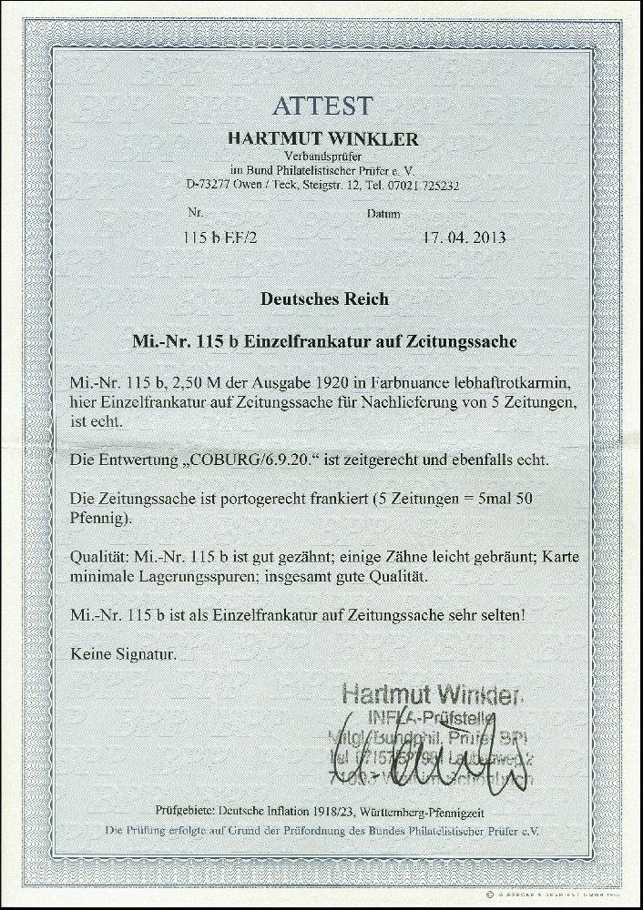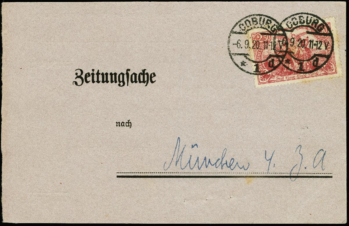 | Zusatzinformationen und Suchstichworte: | 366. Auktion Heinrich Köhler Auktionstermin 19.-24.03.2018 Los 1587 2,50 M. lebhaftrotkarmin als portogerechte Einzelfrankatur auf Zeitungssache für die Nachlieferung von fünf Zeitungen von "COBURG 6.9.20" nach München, in der Zähnung etwas fleckig, sonst in guter Bedarfserhaltung, seltene Frankatur, Fotoattest Winkler BPP (2013) (Mi. 600,-) Zuschlag 260,00 EUR |