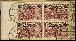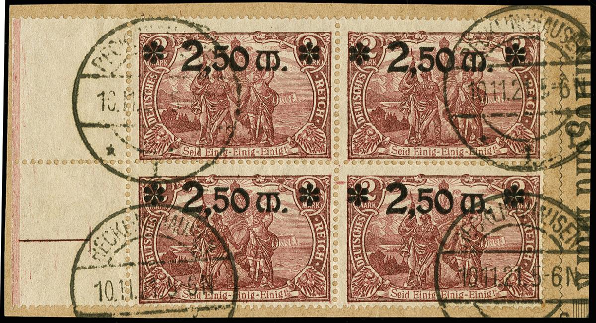 | Zusatzinformationen und Suchstichworte: | 366. Auktion Heinrich Köhler Auktionstermin 19.-24.03.2018 Los 1605 2,50 M. auf 2 M. braunlila im Viererblock mit links durchgezähntem Bogenrand auf Briefstück, tadellose Erhaltung, sehr seltene Einheit, Fotoattest Weinbuch BPP (2005) (Mi. 2.500,- ++) Ausruf 750,00 EUR |