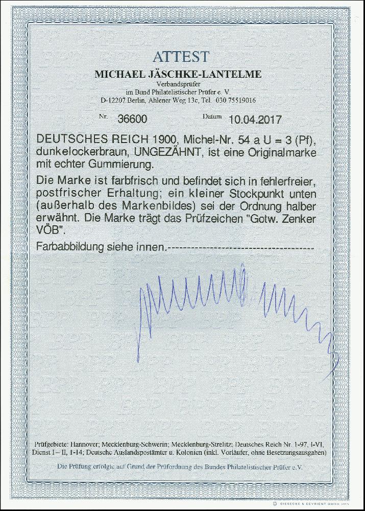 | Zusatzinformationen und Suchstichworte: | 366. Auktion Heinrich Köhler Auktionstermin 19.-24.03.2018 Los 1613 3 Pfg. dunkelockerbraun ungezähnt, farbfrisch, postfrisch, unten mit winzigem Stockpunkt außerhalb des Markenbildes, ansonsten tadellos, sign. Zenker VÖB und Fotoattest Jäschke-L. BPP (2017) (Mi. 2.000,-) Ausruf 400,00 EUR |