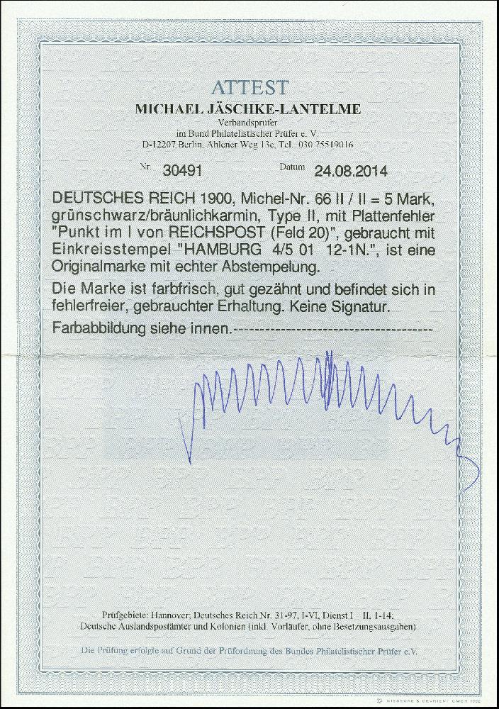 | Prüfer: | Jäschke-Lantelme, Michael (BPP (Bund Philatelistischer Prüfer)) |