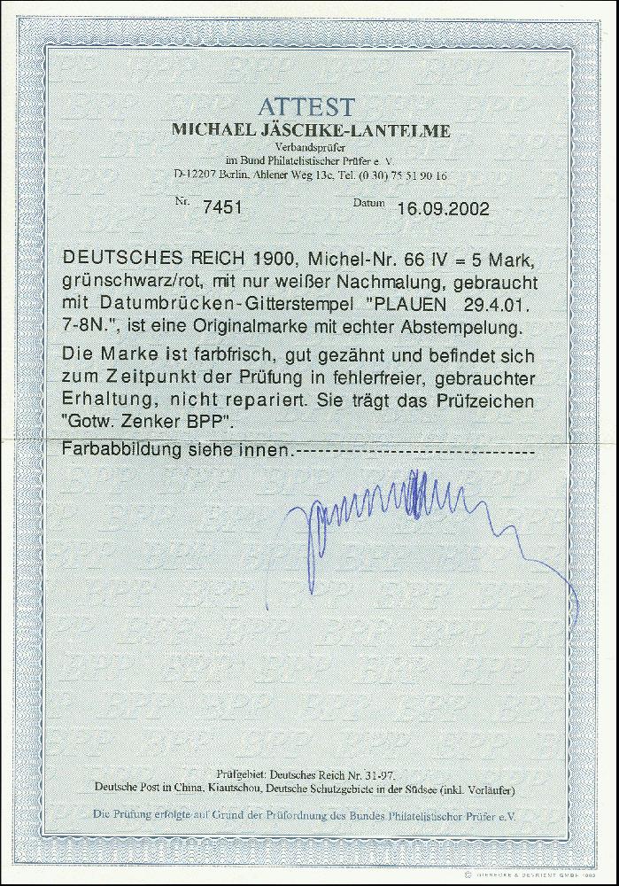 | Prüfer: | Jäschke-Lantelme, Michael (BPP (Bund Philatelistischer Prüfer)) |