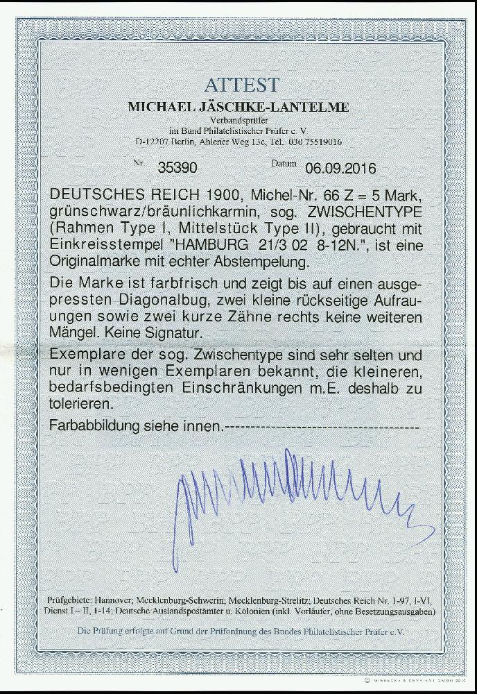 | Zusatzinformationen und Suchstichworte: | 366. Auktion Heinrich Köhler Auktionstermin 19.-24.03.2018 Los 1623 5 M. grünschwarz/bräunlichkarmin, sogen. Zwischentype (Rahmen Type I, Mittelstück Type III), sehr sauber gestempelt, farbfrisch mit ausgepresstem Diagonalbug sowie je zwei rückseitig kleine Aufrauungen bzw. kurze Zähne rechts, ansonsten in guter Gesamterhaltung, optisch an sehr ansprechendes Exemplar dieser äußerst seltenen Marke, Fotoatteste Jäschke (1993) und Jäschke-L. BPP (2016) (Mi. 30.000,-) Ausruf 6.000,00 EUR |
