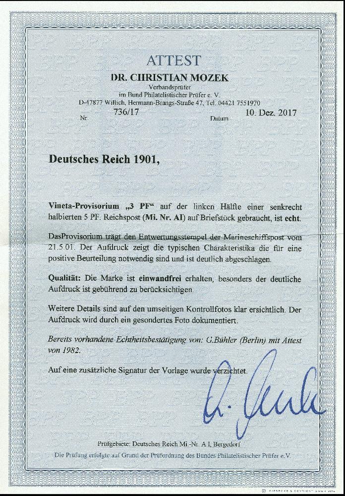 | Zusatzinformationen und Suchstichworte: | 366. Auktion Heinrich Köhler Auktionstermin 19.-24.03.2018 Los 1624 Vineta-Provisorium, 3 PF auf halbierter 5 Pfg., linke Hälfte mit sehr klarem und kräftigen Aufdruck, sauber mit Stempel "KDMSP No. 1 21/5 01" auf Briefstück, ein sehr schönes Stück dieser seltenen Marke, sign. Bühler mit Fotoattest (1982) und Fotoattest Mozek BPP (2017) (Mi. 10.000,-) Zuschlag 3.800,00 EUR |