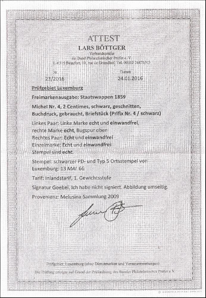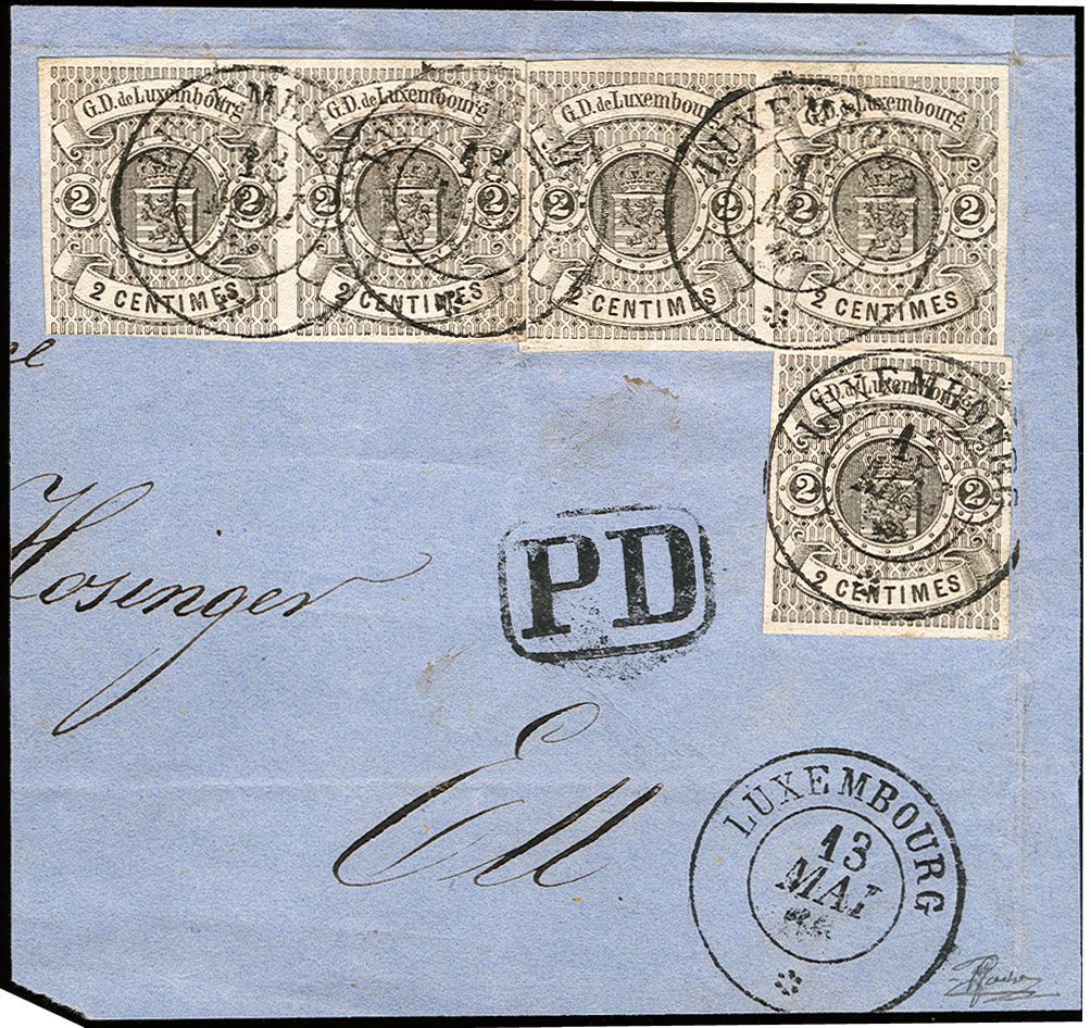 | Zusatzinformationen und Suchstichworte: | Briefhälfte aus der bekannten Korrespondenz der Witwe Hosinger, wohnhaft in Ell. Zählt man das Stück zu den Briefen, dann ist es der Brief bzw. Streifband mit den meisten 2 centimes Marken dieser Ausgabe. Briefe und Streifbänder dieser Marke sind eine große Seltenheit wie die Registrierung zeigt: -Einzelfrankatur auf Drucksache. -Einzelfrankatur gesichtet, nicht registriert. -Paar auf Streifband. -Dreierstreifen auf Streifband. -Dreierstreifen + Michel Nr. 9 auf Brief. -Mischfrankatur Michel Nr. 4+ Nr 5+ Nr. 7 -Mischfrankatur Mchel Nr. 4 + Paar Nr. 5 (Ohne Abbildung, Sammlung Francis Rhein. (Es sind drei solcher Fragmente bekannt. (Nicht erwähnt sind Fragmente der Zeitung der Aktionär, siehe Attest 000799.) |