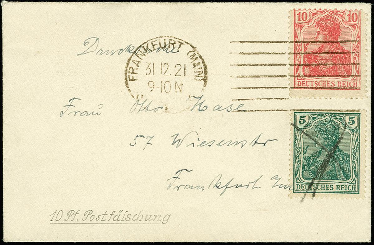 | Zusatzinformationen und Suchstichworte: | 366. Auktion Heinrich Köhler Auktionstermin 19.-24.03.2018 Los 1629 "Chemnitzer Postfälschung" 10 Pfg. rot, Type I und Germania 5 Pfg. grün (Heftchenschnitt oben) als portogerechte Frankatur auf kleinformatigem Drucksachen-Umschlag von "FRANKFURT 31.12.21" im Ortsverkehr, sehr schöne Bedarfsverwendung dieser auf Beleg äußerst seltenen Fälschung zum Schaden der Post, Kabinett, Fotoattest Jäschke-L. BPP Ausruf 3.000,00 EUR |