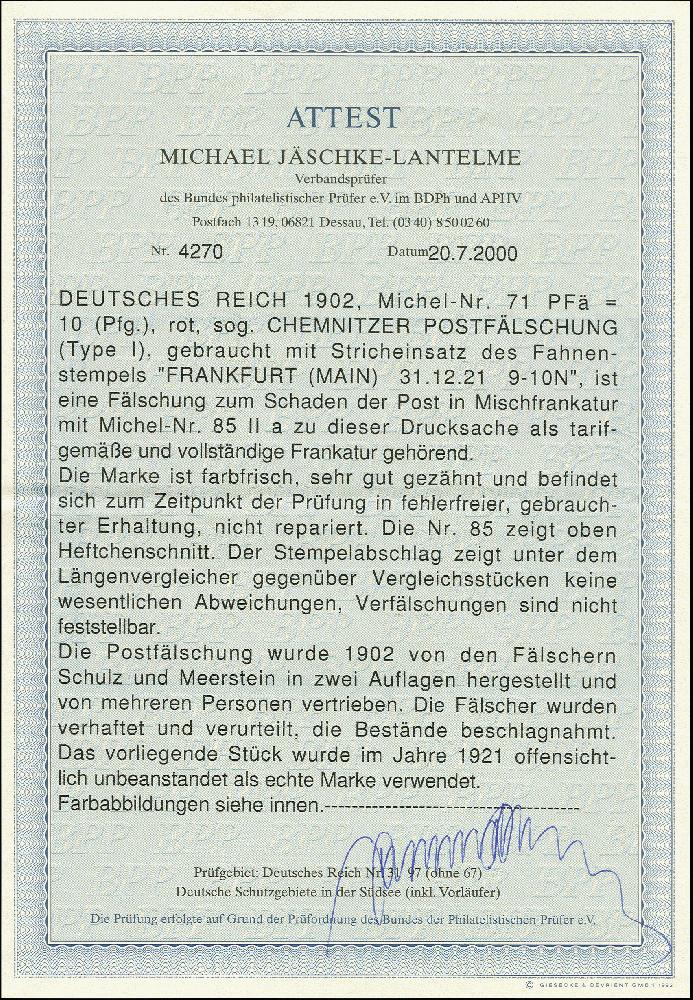 | Prüfer: | Jäschke-Lantelme, Michael (BPP (Bund Philatelistischer Prüfer)) |
