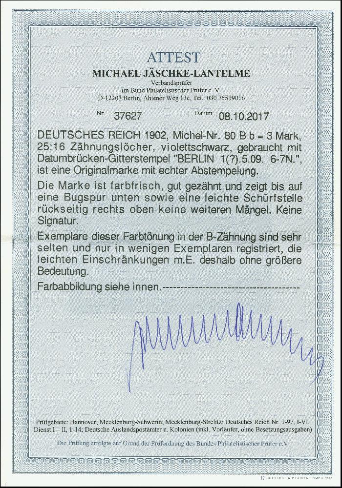 | Prüfer: | Jäschke-Lantelme, Michael (BPP (Bund Philatelistischer Prüfer)) |