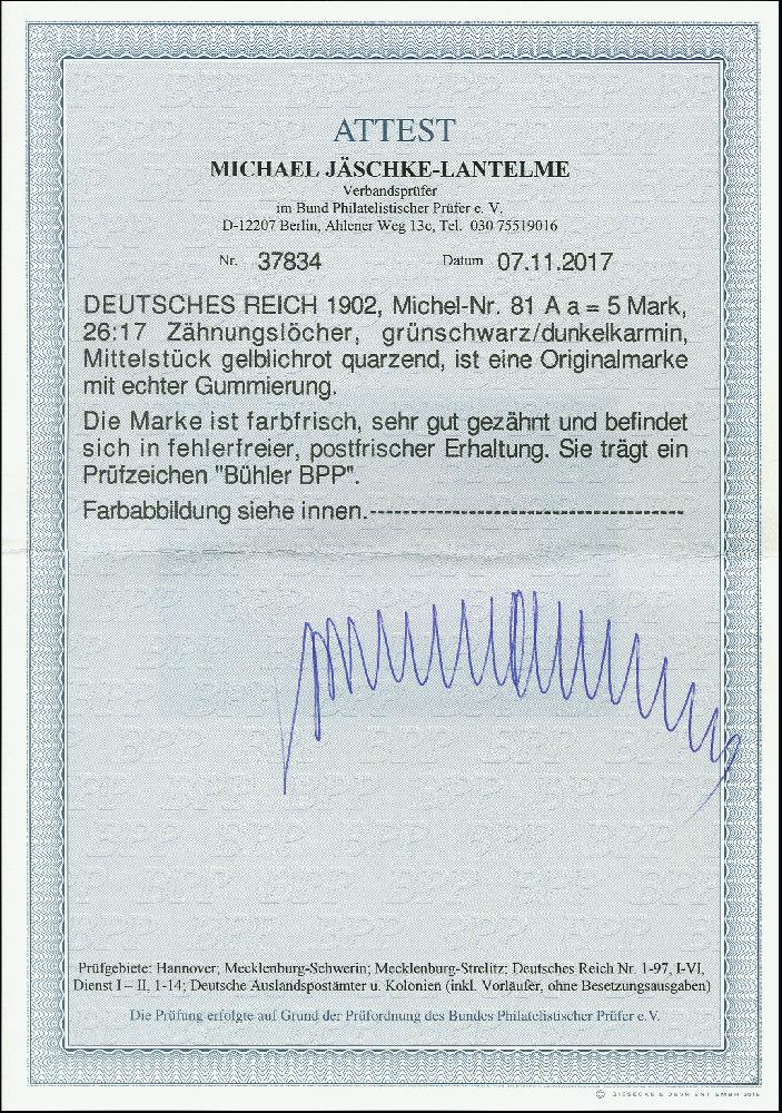 | Prüfer: | Jäschke-Lantelme, Michael (BPP (Bund Philatelistischer Prüfer)) |
