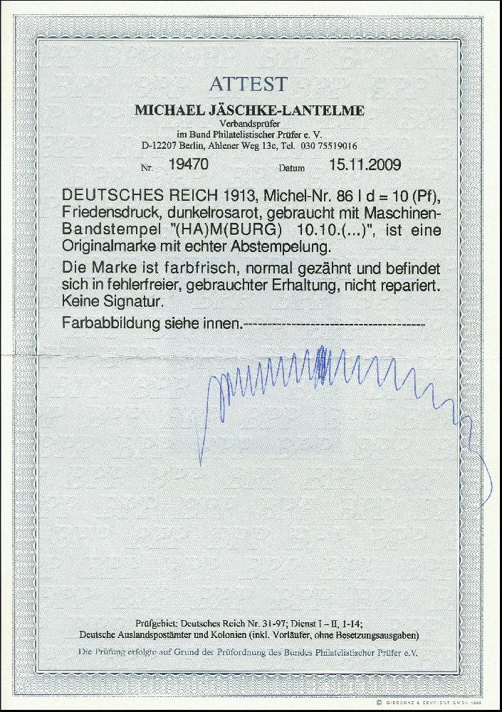 | Prüfer: | Jäschke-Lantelme, Michael (BPP (Bund Philatelistischer Prüfer)) |
