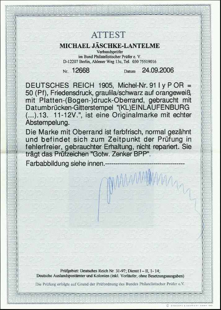 | Prüfer: | Jäschke-Lantelme, Michael (BPP (Bund Philatelistischer Prüfer)) |