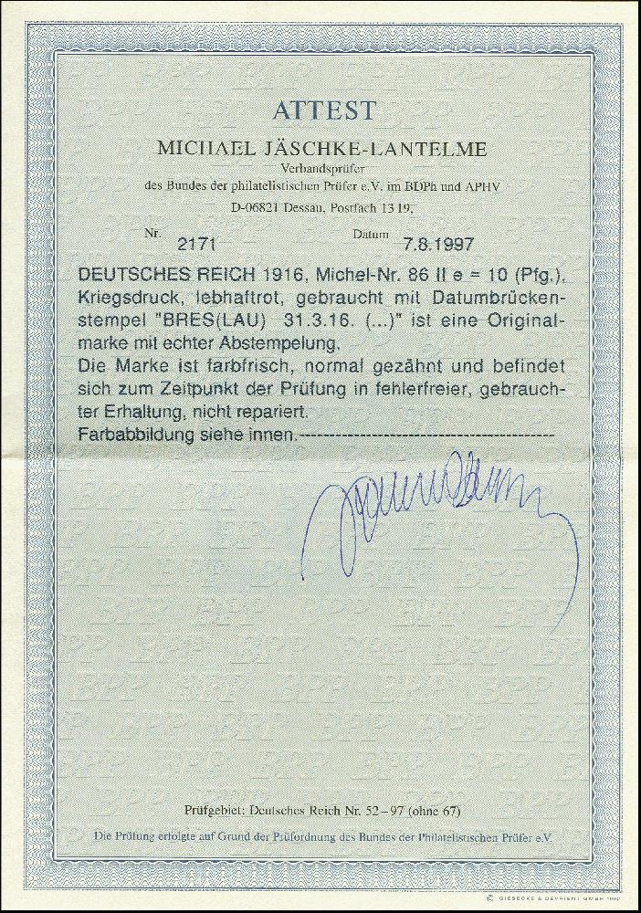 | Prüfer: | Jäschke-Lantelme, Michael (BPP (Bund Philatelistischer Prüfer)) |