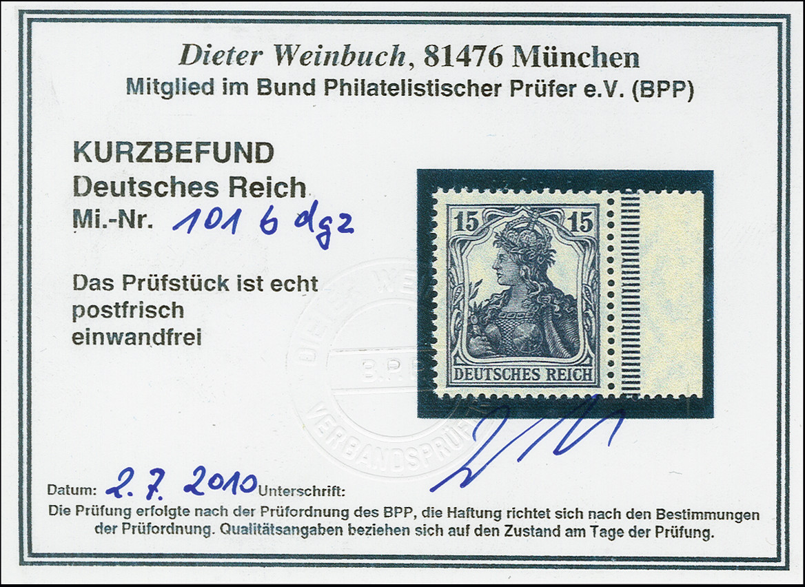 | Prüfer: | Weinbuch, Dieter (BPP (Bund Philatelistischer Prüfer)) |