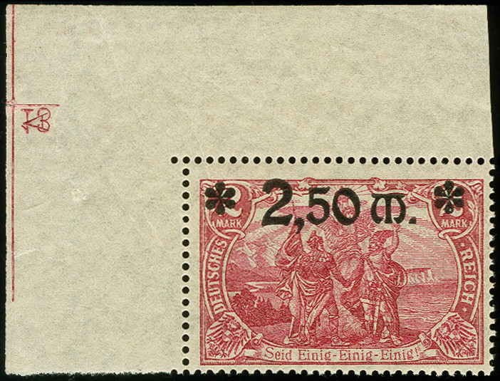 | Zusatzinformationen und Suchstichworte: | 366. Auktion Heinrich Köhler Auktionstermin 19.-24.03.2018 Los 1660 1920, Aufdruckausgabe 2,50 M. auf 2 Mark lilarosa, aus der linken oberen Bogenecke mit Druckerzeichen "A", sauber ungebraucht, tadellos, Befund Tworek BPP(2015) Ausruf 150,00 EUR |