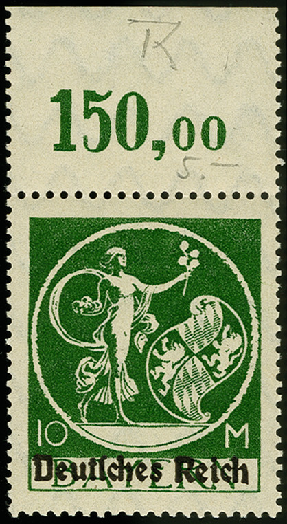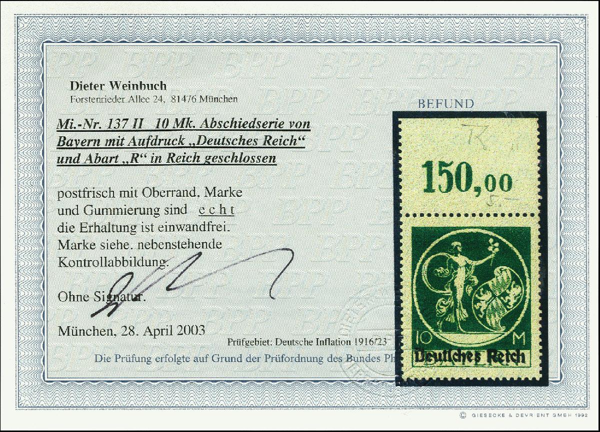 | Zusatzinformationen und Suchstichworte: | 366. Auktion Heinrich Köhler Auktionstermin 19.-24.03.2018 Los 1663 1920, Bayern Abschied 10 Mark, Oberrandstück in Aufdrucktype 2, postfrisch, kleine Fingerspuren im Oberrand, tadellos, Befund Weinbuch BPP (2003) Ausruf 120,00 EUR |