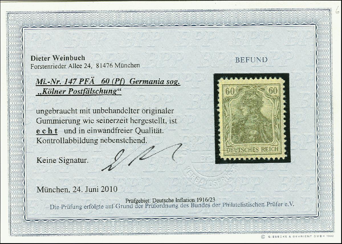 | Zusatzinformationen und Suchstichworte: | 366. Auktion Heinrich Köhler Auktionstermin 19.-24.03.2018 Los 1666 Germania 60 Pfg., Steindruck ohne Wasserzeichen mit Linienzähnung 13, sogen. "Kölner Postfälschung", postfrisch, tadellos, in dieser Erhaltung selten, Fotobefund Weinbuch BPP (2010) (Mi. 500,-) Ausruf 100,00 EUR |