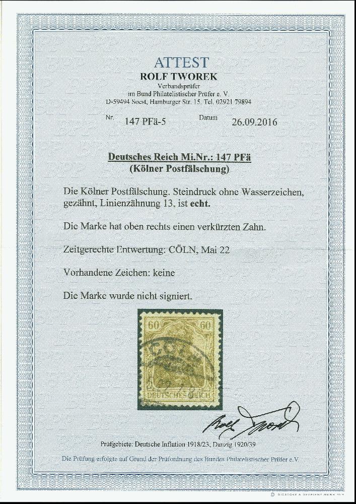 | Zusatzinformationen und Suchstichworte: | 366. Auktion Heinrich Köhler Auktionstermin 19.-24.03.2018 Los 1668 Germania 60 Pfg., Steindruck ohne Wasserzeichen mit Linienzähnung 13, sogen. "Kölner Postfälschung", sauber gestempelt, verkürzter Eckzahn oben rechts, sonst tadellos, selten, Fotoattest Tworek BPP (2016) (Mi. 2.500,-) Ausruf 500,00 EUR |