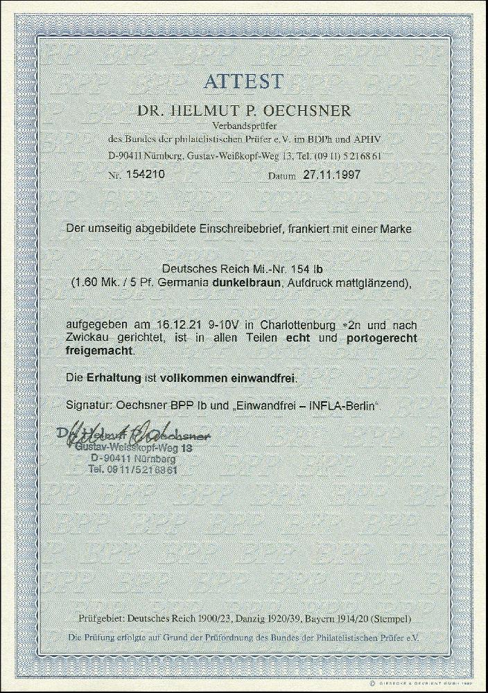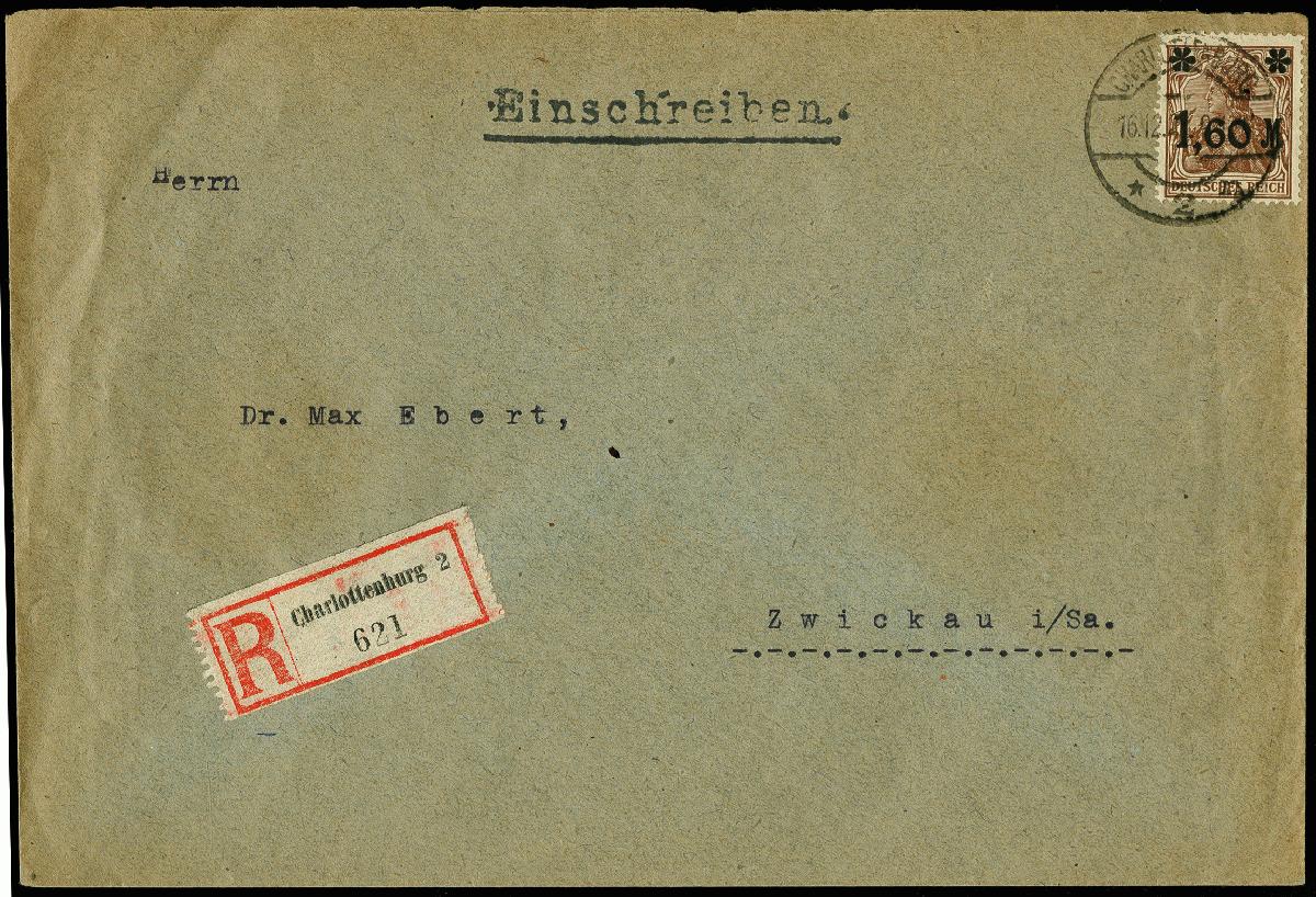 | Zusatzinformationen und Suchstichworte: | 366. Auktion Heinrich Köhler Auktionstermin 19.-24.03.2018 Los 1673 Aufdruck mattglänzend: 1921, 1,60 M. auf 5 Pfg. dunkelbraun als portogerechte Einzelfrankatur auf R-Brief von "CHARLOTTENBURG 16.12.21" nach Zwickau mit Ankunftsstempel, Umschlag mit leichten Beförderungs- und Alterungsspuren im Rand, Marke tadellos, sign. Oechsner BPP mit Fotoattest (1997) (Mi. 1.200,-) Zuschlag 180,00 EUR |