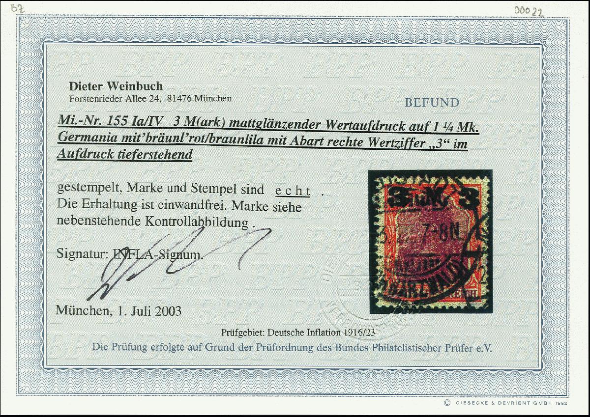 | Prüfer: | Weinbuch, Dieter (BPP (Bund Philatelistischer Prüfer)) |