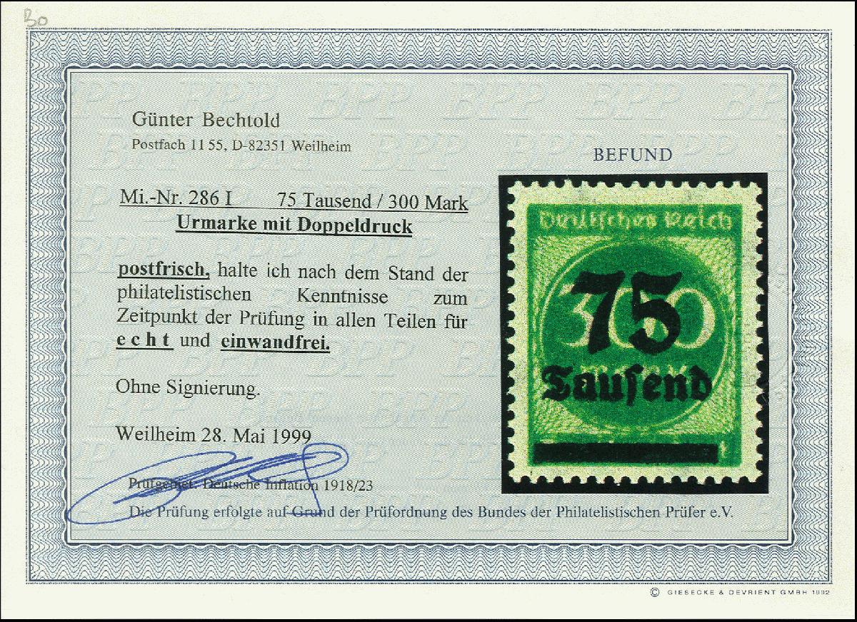 | Zusatzinformationen und Suchstichworte: | 366. Auktion Heinrich Köhler Auktionstermin 19.-24.03.2018 Los 1695 75 Tausend auf 300 M. mit Doppeldruck der Urmarke, postfrisch, tadellos, Fotobefund Bechtold BPP (1999) (Mi. 450,-) Zuschlag 100,00 EUR |