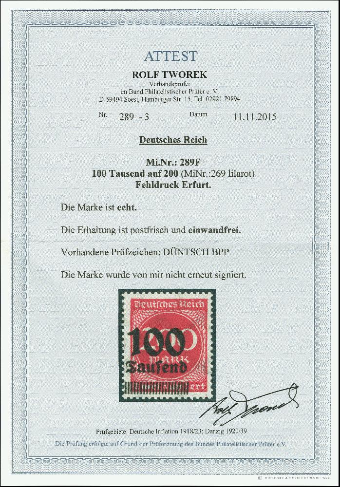 | Zusatzinformationen und Suchstichworte: | 366. Auktion Heinrich Köhler Auktionstermin 19.-24.03.2018 Los 1696 100 Tausend auf 200 M. lilarot (Fehldruck Erfurt), postfrisch, tadellos, sign. Düntsch BPP und Fotoattest Tworek BPP (2015) (Mi. 3.500,-) Zuschlag 750,00 EUR |