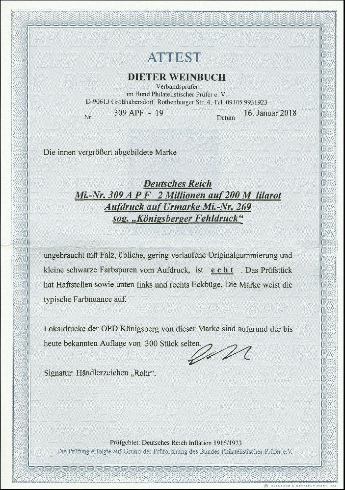 | Prüfer: | Weinbuch, Dieter (BPP (Bund Philatelistischer Prüfer)) |