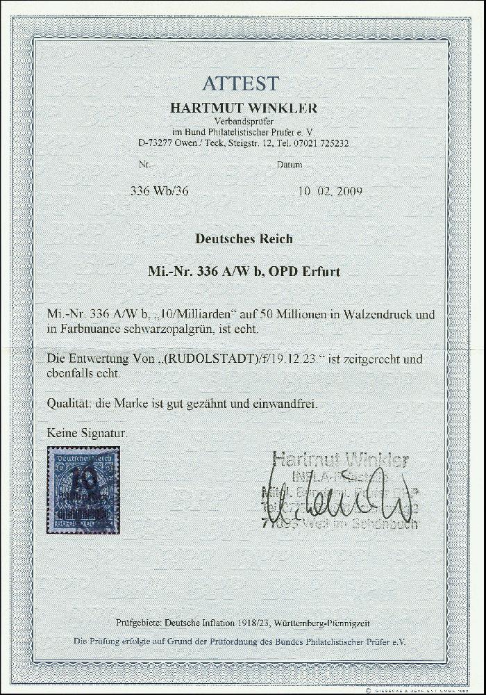 | Zusatzinformationen und Suchstichworte: | 366. Auktion Heinrich Köhler Auktionstermin 19.-24.03.2018 Los 1710 10 Mrd. auf 50 Mio. M. schwarzopalgrün, gestempelt, Kabinett, Fotoattest Winkler BPP (2009) Zuschlag 270,00 EUR |