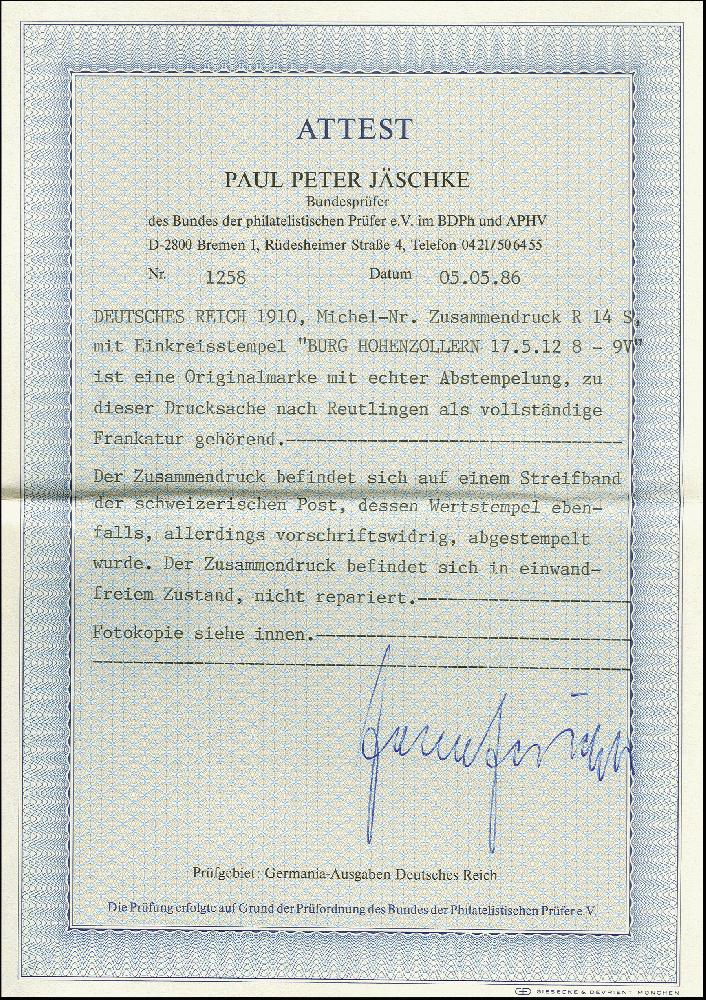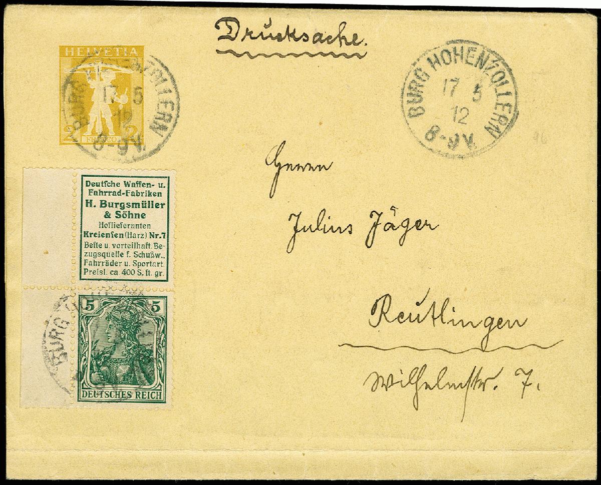 | Zusatzinformationen und Suchstichworte: | 366. Auktion Heinrich Köhler Auktionstermin 19.-24.03.2018 Los 1743 "Burgsmüller & Söhne" + 5 Pfg. mit Heftchenrand links als portogerechte Frankatur auf schweizer Ganzsachenstreifband 2 Rp. (Formblatt) als Drucksache von "BURG HOHENZOLLERN 17.5.12" nach Reutlingen, Streifband unten mit Faltspuren, Zusammendruck tadellos, Fotoattest Jäschke BPP (1986) Zuschlag 200,00 EUR |