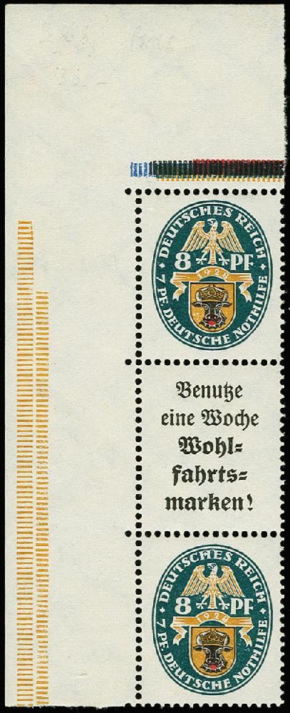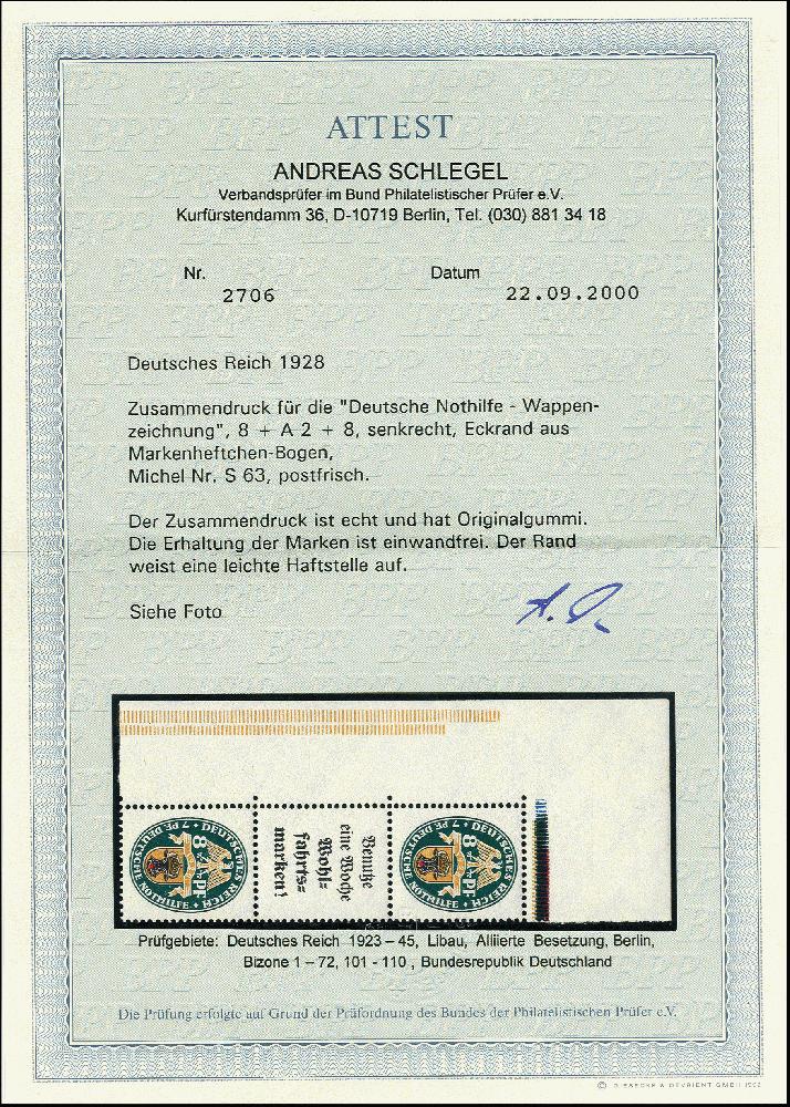 | Zusatzinformationen und Suchstichworte: | 366. Auktion Heinrich Köhler Auktionstermin 19.-24.03.2018 Los 1767 1928, Nothilfe 8+A2+8 Pfg. aus der linken oberen Bogenecke, postfrisch, tadellos, im Rand leichte Haftstellen, Fotoattest Schlegel BPP (2000) (Mi. 2.000,-) Zuschlag 360,00 EUR |