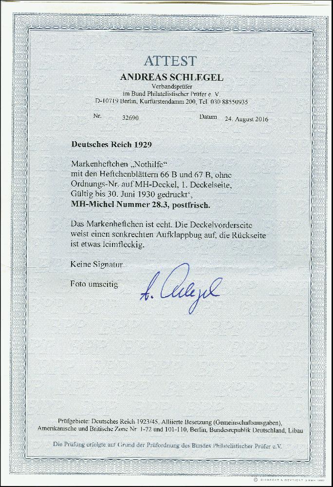 | Zusatzinformationen und Suchstichworte: | 366. Auktion Heinrich Köhler Auktionstermin 19.-24.03.2018 Los 1769 1929, Nothilfe, ohne Ordnungsnummer, 1. Deckelseite mit Gültigkeitsangabe "30. Juni 1930, Heftchen mit allen Zwischenblättern und Heftchenblätter, postfrisch, senkrechter Aufklappbug, Rückseite gering leimfleckig, sonst tadellos, ein sehr seltenes Heftchen, Fotoattest Schlegel BPP (2016) (Mi. 7.000,-) Ausruf 800,00 EUR |