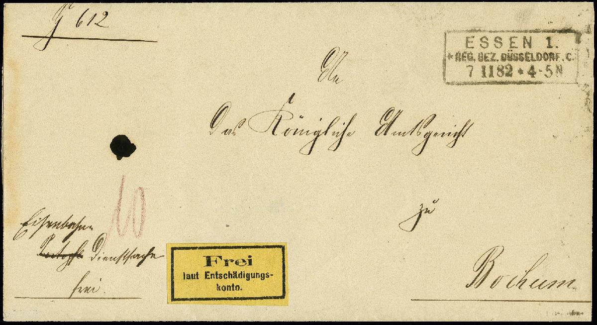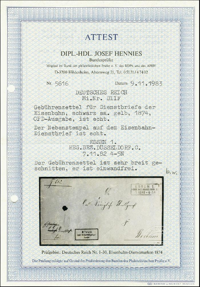| Zusatzinformationen und Suchstichworte: | 366. Auktion Heinrich Köhler Auktionstermin 19.-24.03.2018 Los 1778 1874, Zettel der OPD Köln auf Eisenbahn-Dienstsache von "ESSEN 1. REG.BEZ.DÜSSELDORF.C. 7 11 82" nach Bochum, Fotoattest Hennies BPP Zuschlag 600,00 EUR |