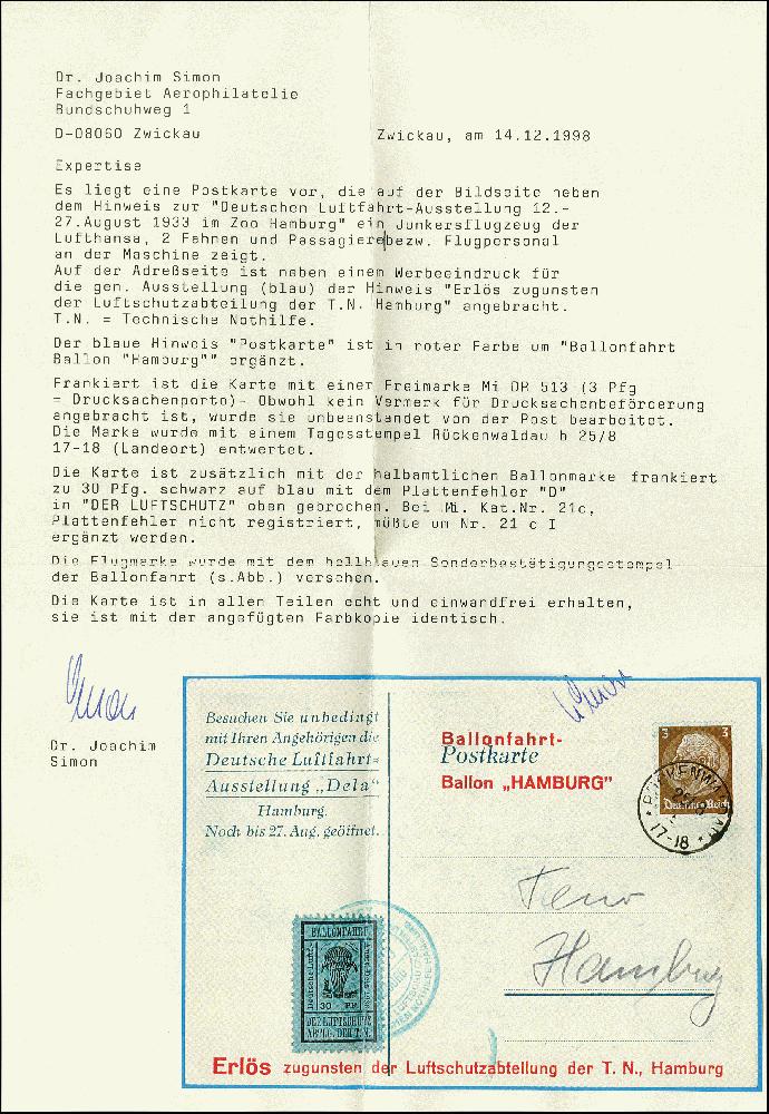 | Zusatzinformationen und Suchstichworte: | 366. Auktion Heinrich Köhler Auktionstermin 19.-24.03.2018 Los 1804 1933, Ballonfahrt 30 Pfennig schwarz auf hellultramarin, mit Plattenfehler "D" von "DER LUFTSCHUTZ" sauber mit Stempel auf anlassbezogener Karte mit Zufrankatur nach Hamburg, tadellos, Fotoattest Simon BPP (1998) Ausruf 250,00 EUR |