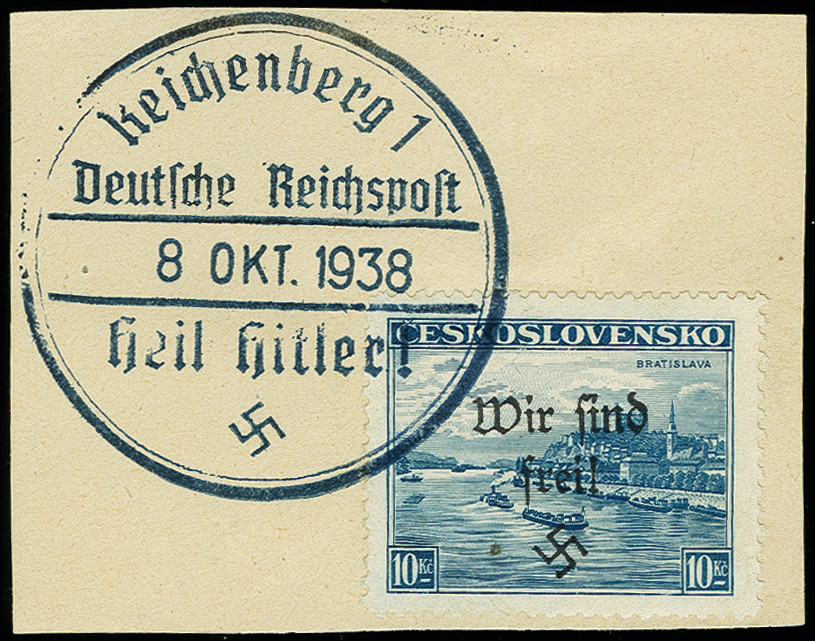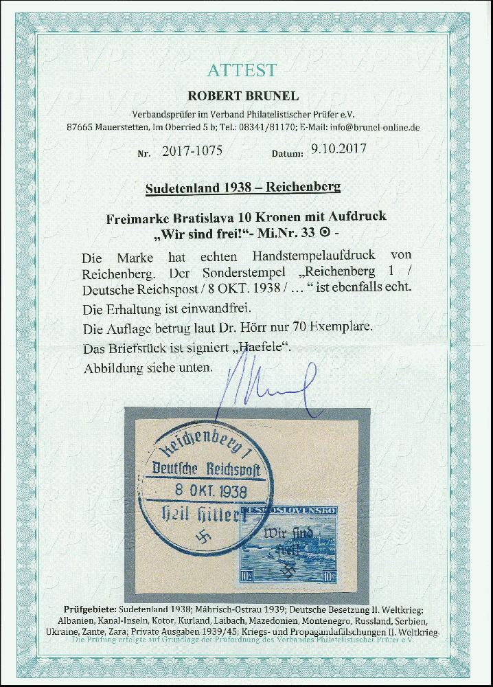 | Zusatzinformationen und Suchstichworte: | 366. Auktion Heinrich Köhler Auktionstermin 19.-24.03.2018 Los 2110 Freimarke Bratislava 10 Kc mit Stempel "Reichenberg 8.X.1938" auf Briefstück, tadellos, Fotoattest Brunel (2017) (Mi. 900,-) Ausruf 200,00 EUR |