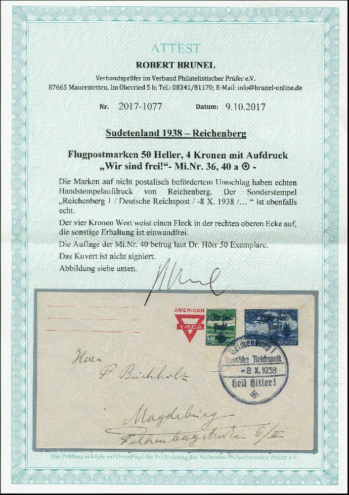 | Zusatzinformationen und Suchstichworte: | 366. Auktion Heinrich Köhler Auktionstermin 19.-24.03.2018 Los 2112 Flugpost 4 Kc. und Unterrandstück 50 H. mit Stempel "Reichenberg 8.X.1938" auf Umschlag, 4 Kc. mit Fleck rechts oben, ansonsten tadellos, Fotoattest Brunel BPP (2017) (Mi. 1.050,-) Ausruf 200,00 EUR |