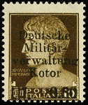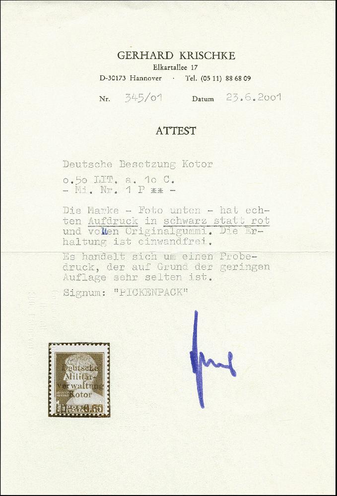 | Zusatzinformationen und Suchstichworte: | 366. Auktion Heinrich Köhler Auktionstermin 19.-24.03.2018 Los 2171 1944, 0.50 Lit auf 10 C. mit schwarzem statt rotem Probeaufdruck, postfrisch, tadellos, sign. Pickenpack und Fotoattest Krischke (2001) (Mi. 1.600,-) Zuschlag 200,00 EUR |