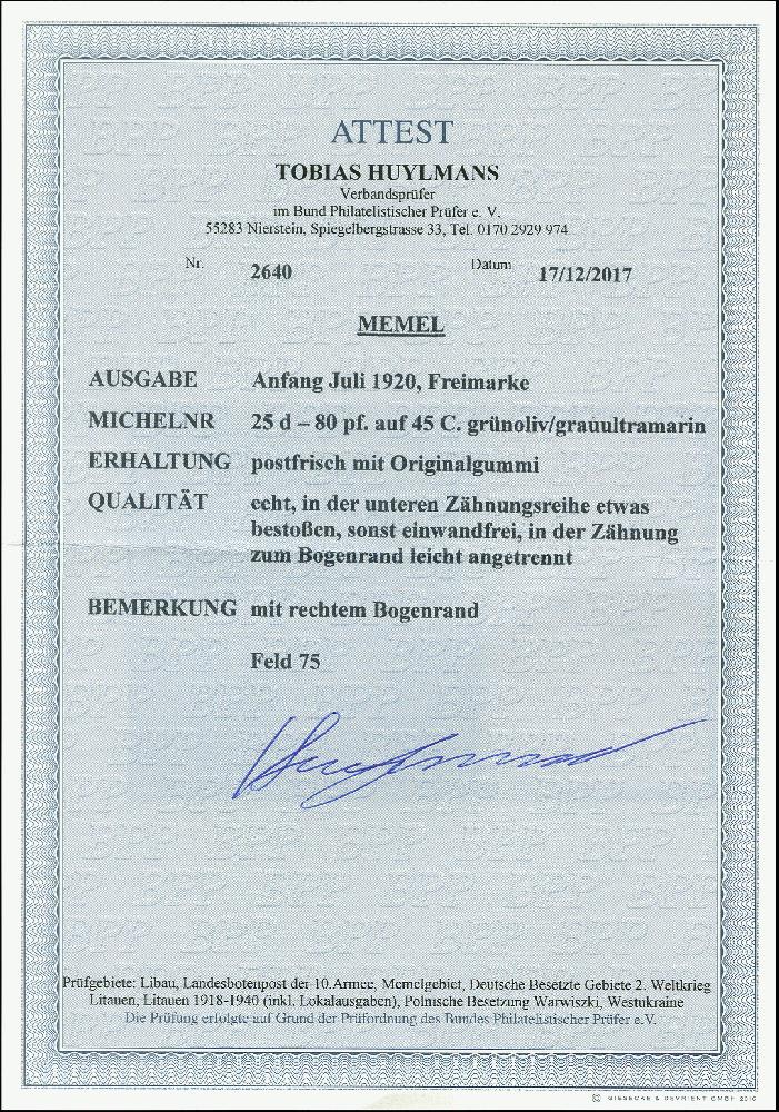 | Prüfer: | Huylmans, Tobias (BPP (Bund Philatelistischer Prüfer)) |
