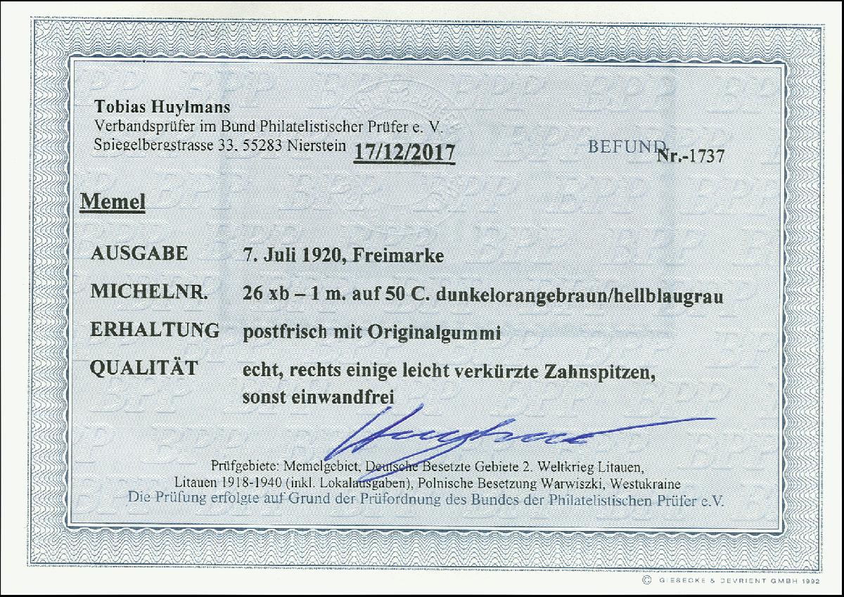 | Prüfer: | Huylmans, Tobias (BPP (Bund Philatelistischer Prüfer)) |