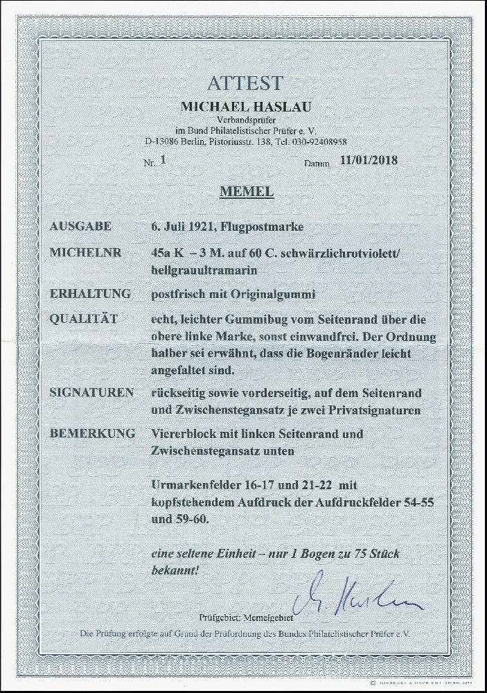 | Prüfer: | Haslau, Michael (BPP (Bund Philatelistischer Prüfer)) |