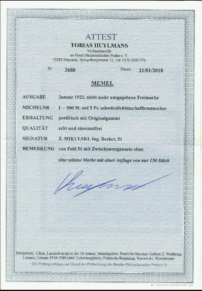 | Zusatzinformationen und Suchstichworte: | 366. Auktion Heinrich Köhler Auktionstermin 19.-24.03.2018 Los 2049 1923, Unverausgabte 500 M. auf 5 Fr. mit Zwischenstegansatz oben, postfrisch, tadellos, in dieser Erhaltung eine seltene Marke, sign. Mikulski, Fotoattestkopie Vossen (für ehemaligen Viererblock) und Fotoattest Huylmans BPP (2018) Zuschlag 1.200,00 EUR |