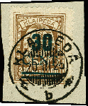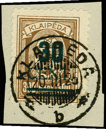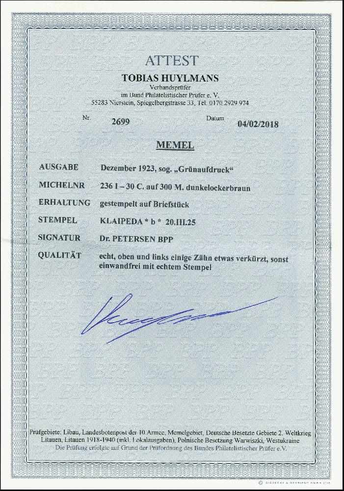 | Zusatzinformationen und Suchstichworte: | 366. Auktion Heinrich Köhler Auktionstermin 19.-24.03.2018 Los 2058 Grünaufdruck 30 C., sauber mit Stempel "KLAIPEDA 20.III.25" auf Briefstück, einige Zähn gering verkürzt, sonst tadellos, sign. Dr. Petersen BPP und Fotoattest Huylmans BPP (2018) (Mi. 1.600,-) Zuschlag 160,00 EUR |