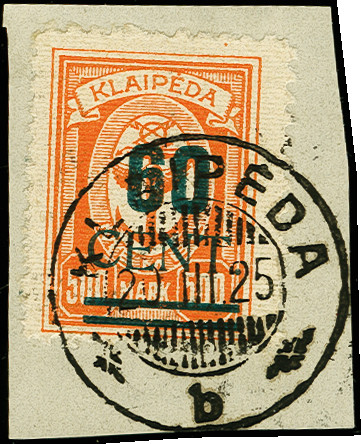 | Zusatzinformationen und Suchstichworte: | 366. Auktion Heinrich Köhler Auktionstermin 19.-24.03.2018 Los 2059 Grünaufdruck 60 C., sauber mit Stempel "KLAIPEDA 20.III.25" auf Briefstück, einige Zähne etwas verkürzt, sonst tadellos, sign. Dr. Petersen BPP und Fotoattest Huylmans BPP (2018) (Mi. 1.500,-) Zuschlag 160,00 EUR |
