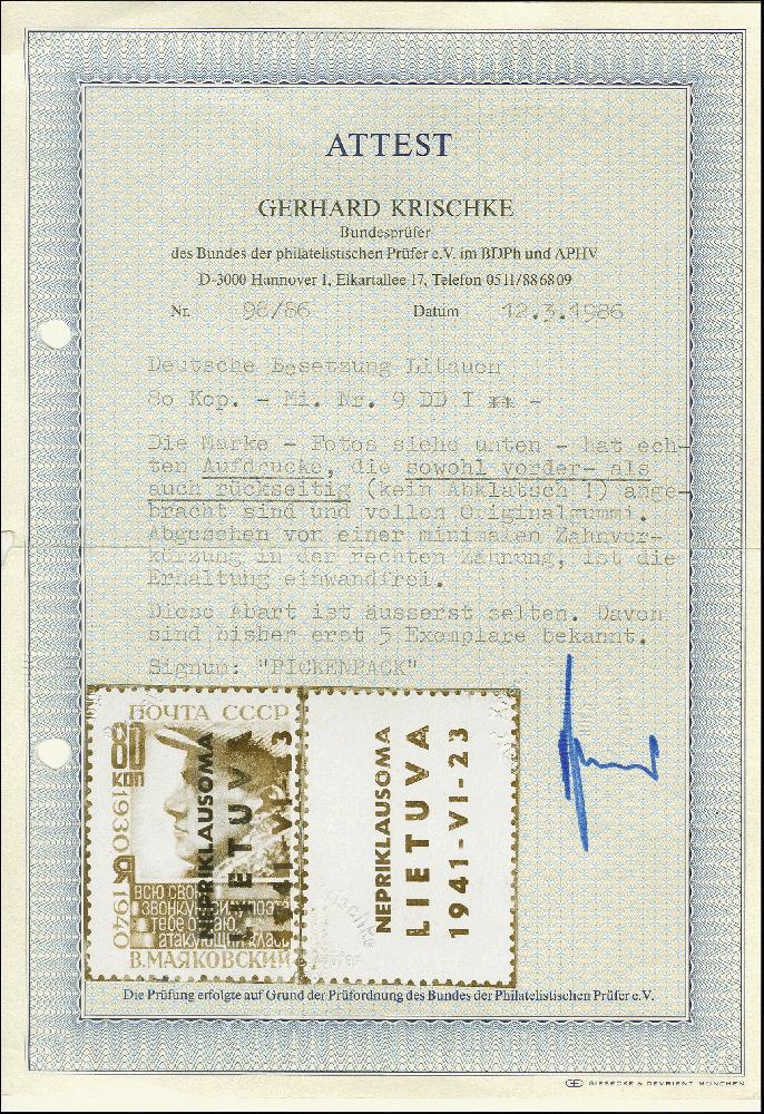 | Zusatzinformationen und Suchstichworte: | 366. Auktion Heinrich Köhler Auktionstermin 19.-24.03.2018 Los 2202 Majakowski 80 K. blau mit zusätzlichem Aufdruck auf der Gummiseite, postfrisch, rechts ein verkürzter Zahn, sonst tadellos, eine sehr seltene Marke, sign. Pickenpack und Fotoattest Krischke BPP (1986) (Mi. 3.500,-) Zuschlag 400,00 EUR |