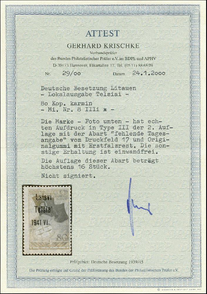 | Prüfer: | Krischke, Gerhard (BPP (Bund Philatelistischer Prüfer)) |